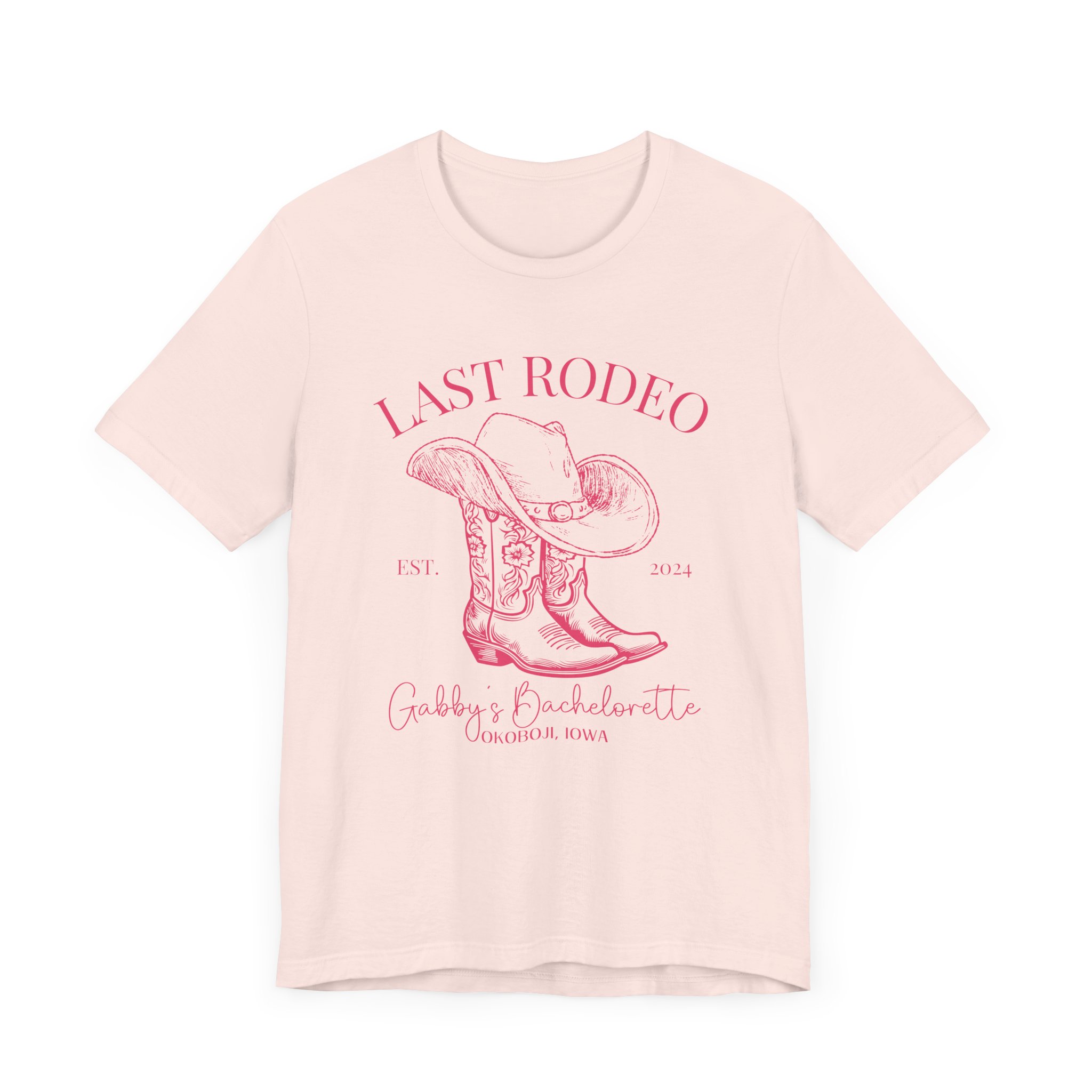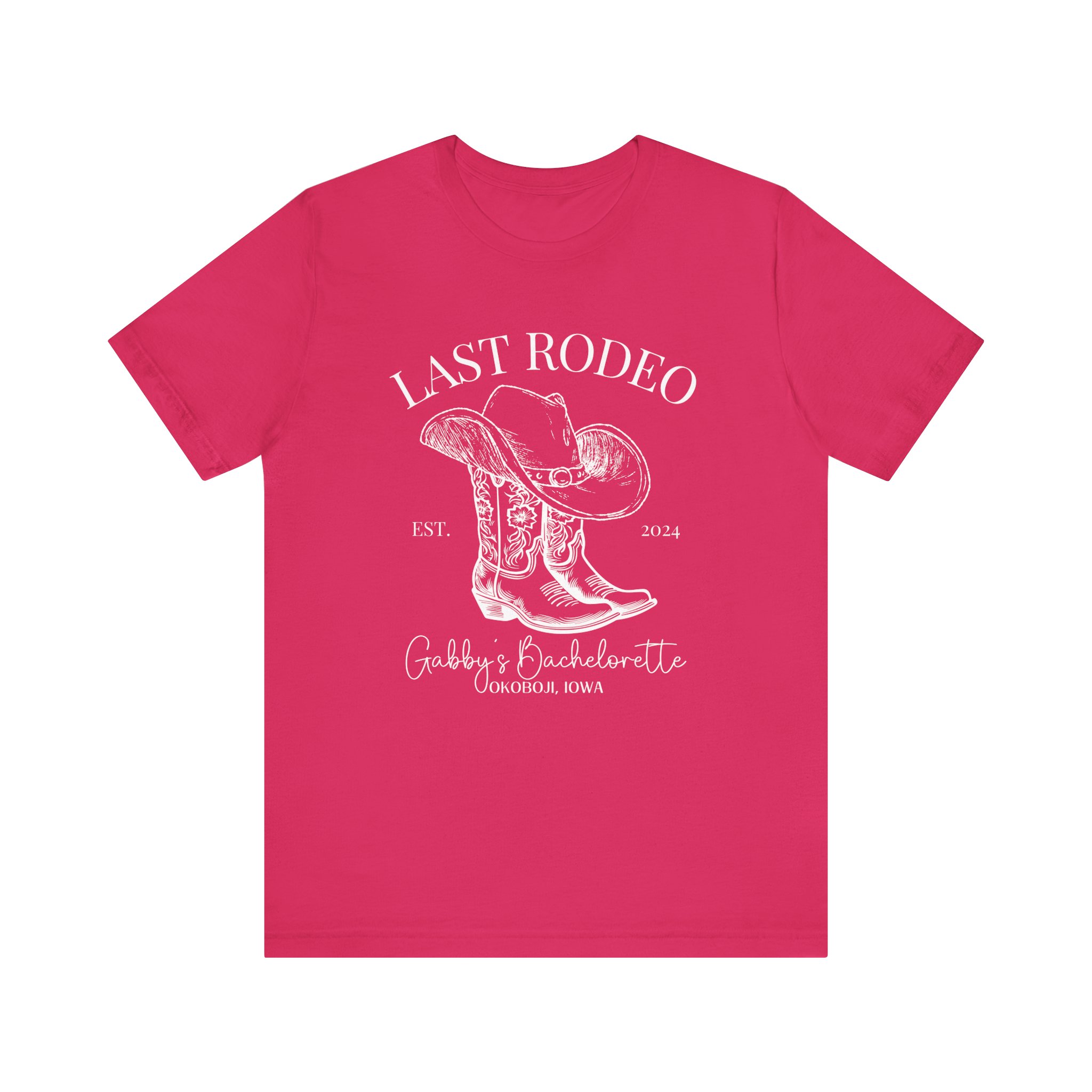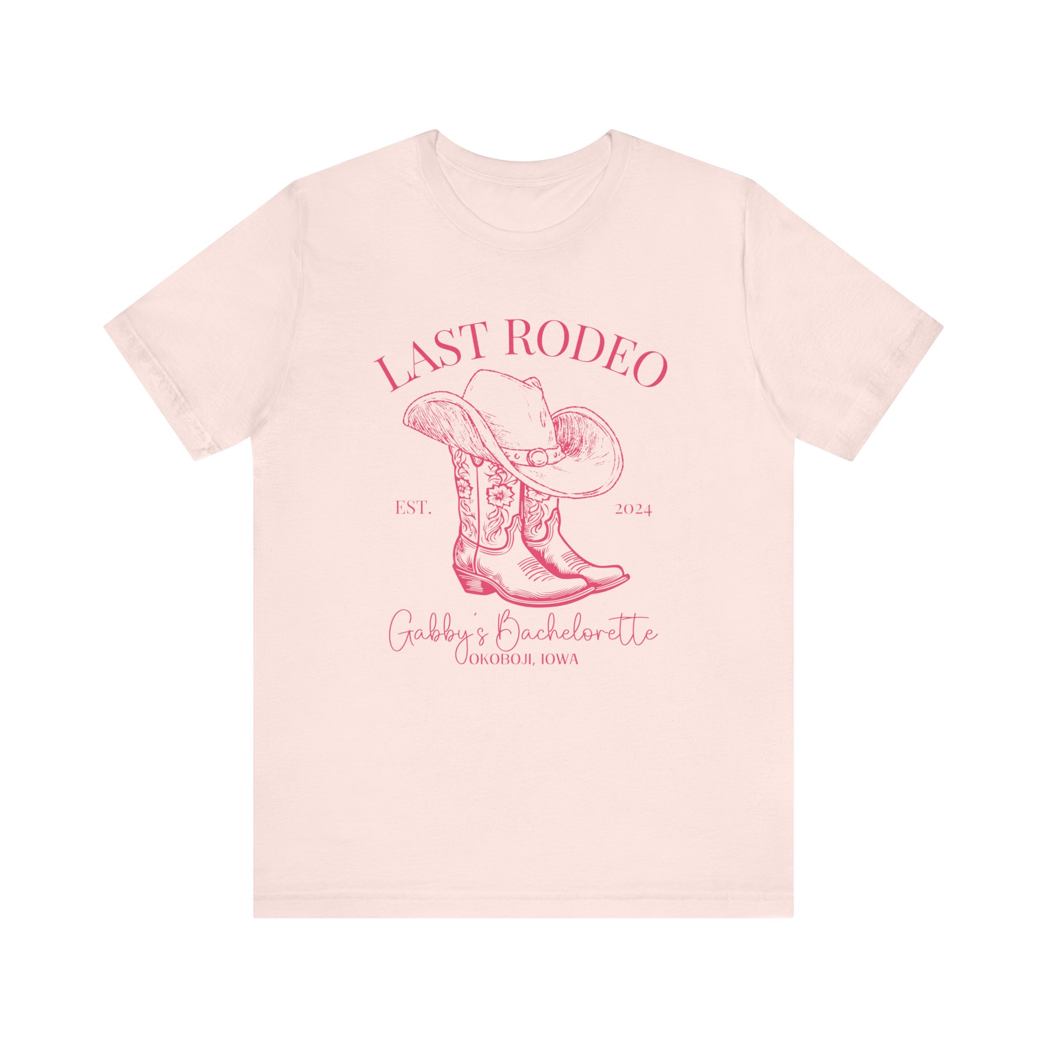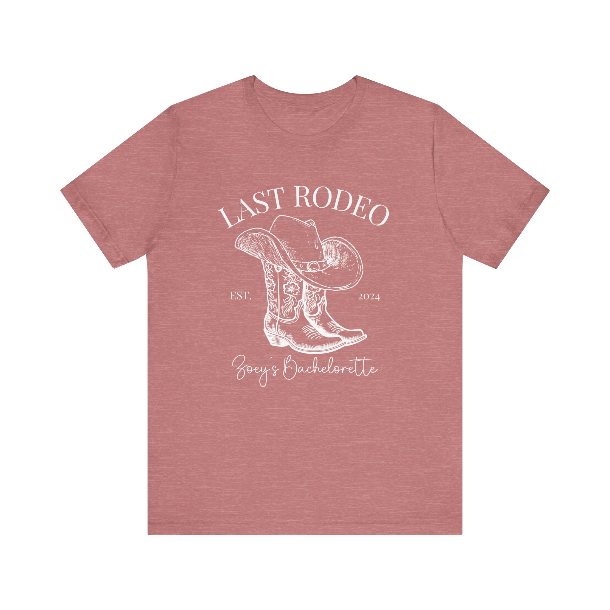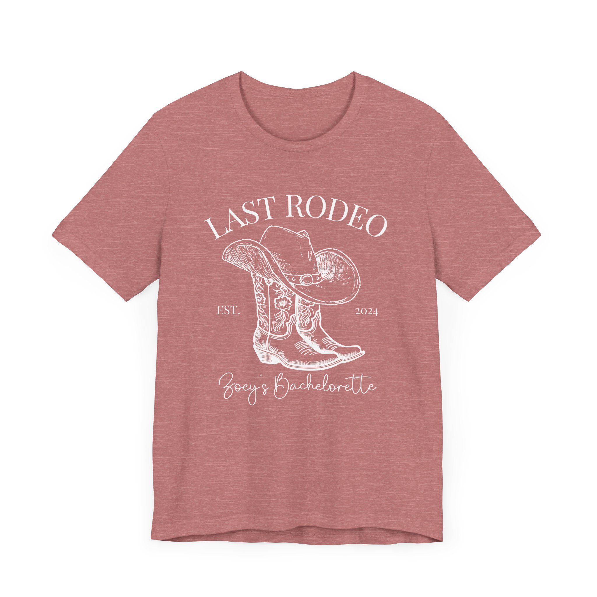Custom Western bachelorette T-shirt perfect for a Last Rodeo themed party. Made with lightweight, breathable fabric, this shirt is ideal for active and leisure wear. The retail fit and classic crew neckline make it suitable for casual and semi-formal settings. Relevant for bachelorette parties, bridal parties, Western-themed celebrations.