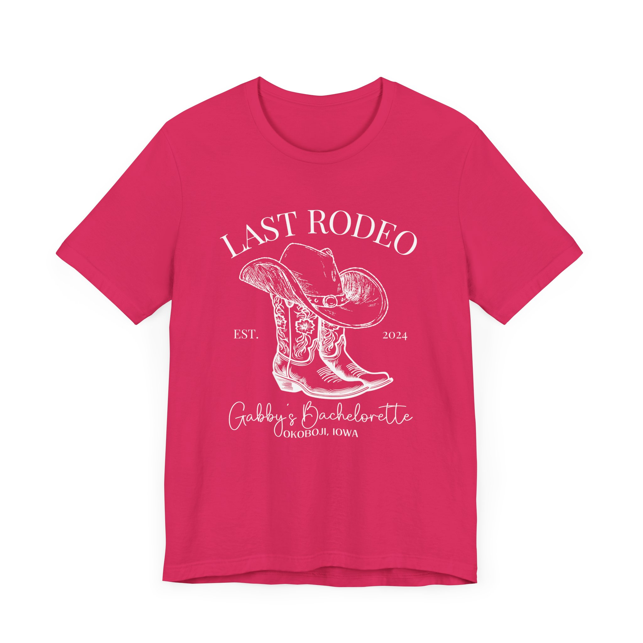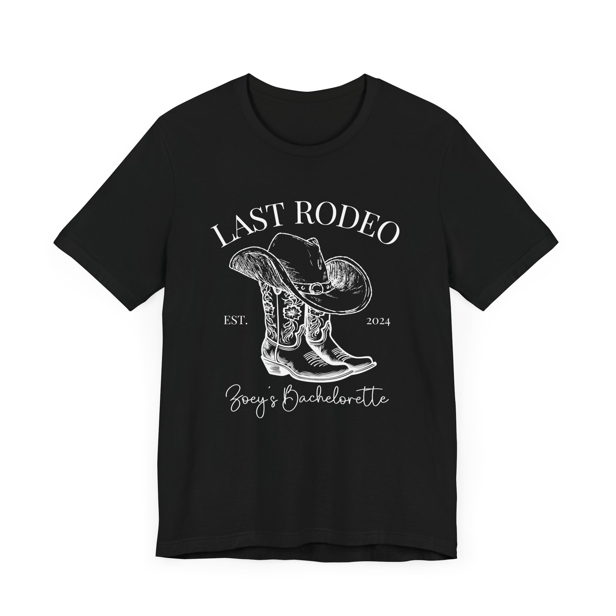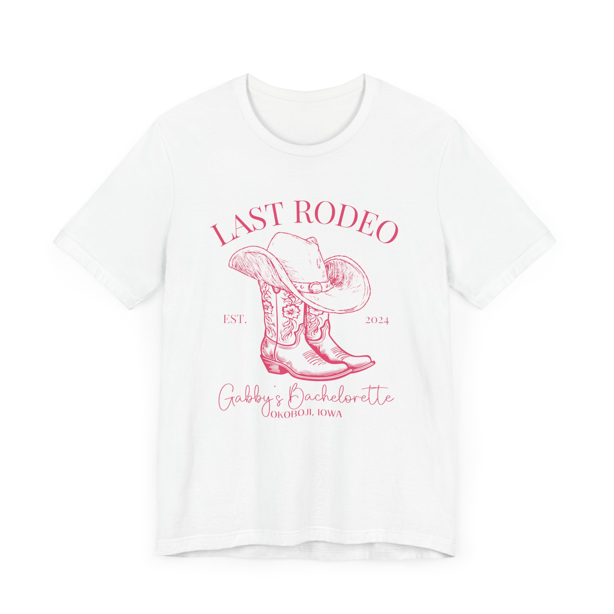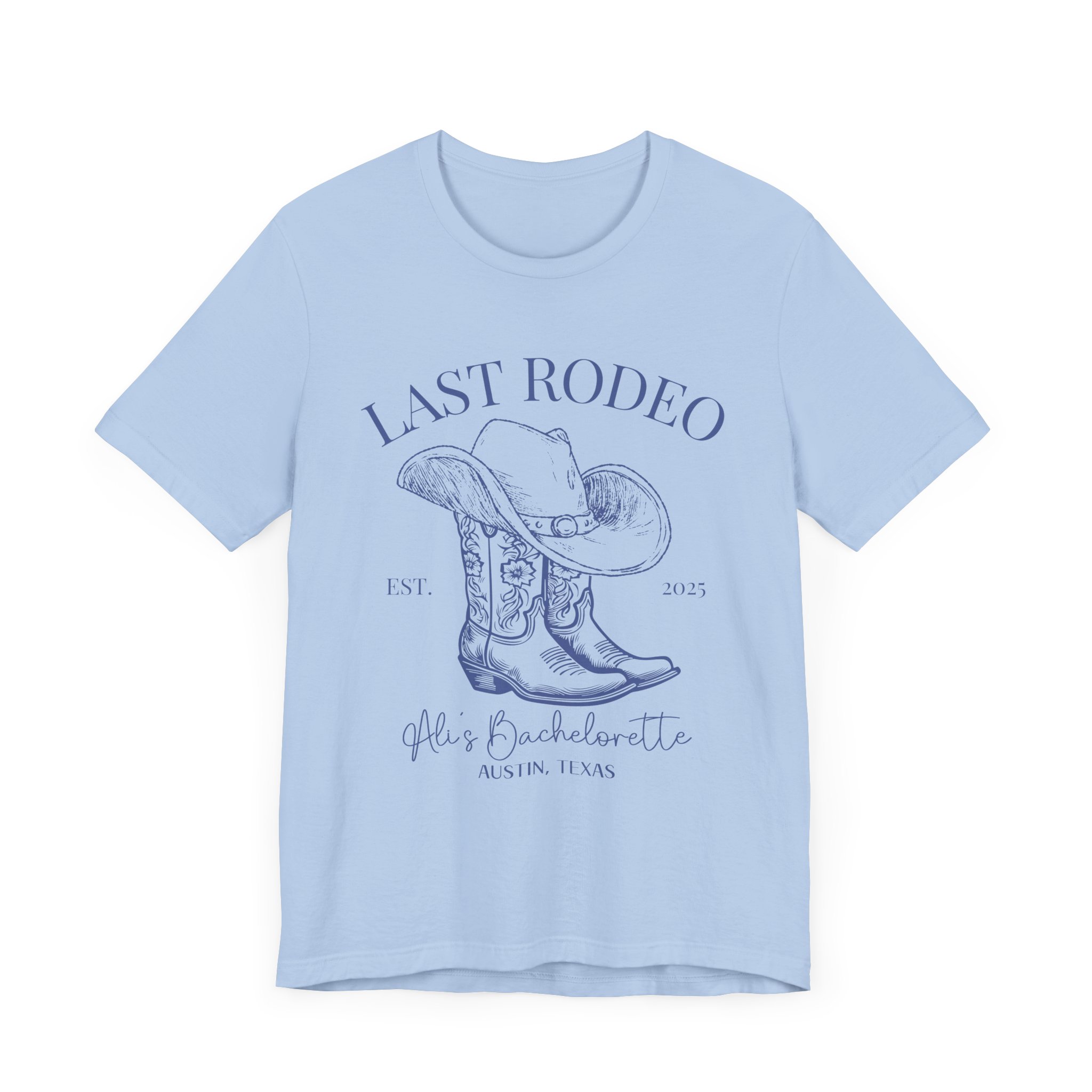 Custom Western bachelorette T-shirt perfect for a Last Rodeo themed party. Made with lightweight, breathable fabric, this shirt is ideal for active and leisure wear. The retail fit and classic crew neckline make it suitable for casual and semi-formal settings. Relevant for bachelorette parties, bridal parties, Western-themed celebrations.